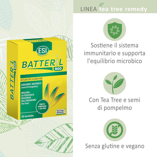 ESI - Batteril 900, Integratore Alimentare di Tea Tree Oil e Semi di Pompelmo, Sostiene il Sistema Immunitario, Favorisce l'Equilibrio Microbico, Senza Glutine e Vegan, 30 Tavolette