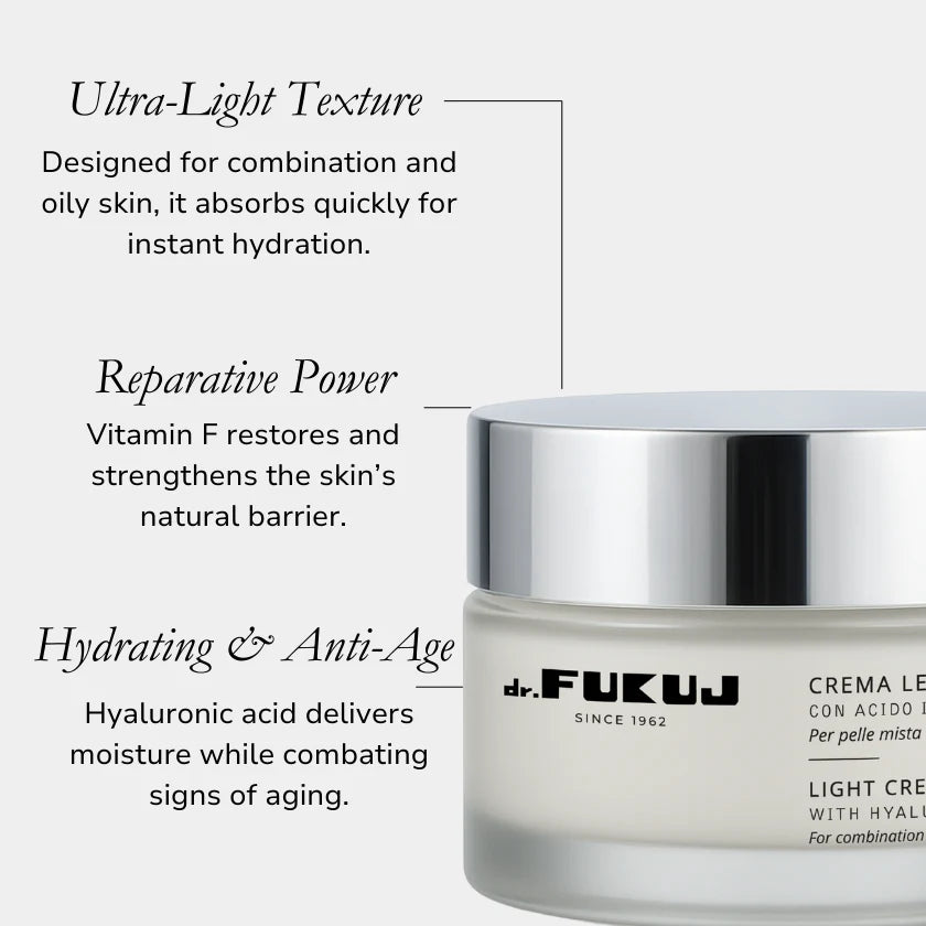 Crema dalla texture iper-leggera, formulata per le pelli miste o grasse. La sua texture leggera permette un rapido assorbimento e un’idratazione istantanea. Abbina l’efficacia ricostitutiva della vitamina F all’effetto idratante e anti-age dell’acido ialuronico.